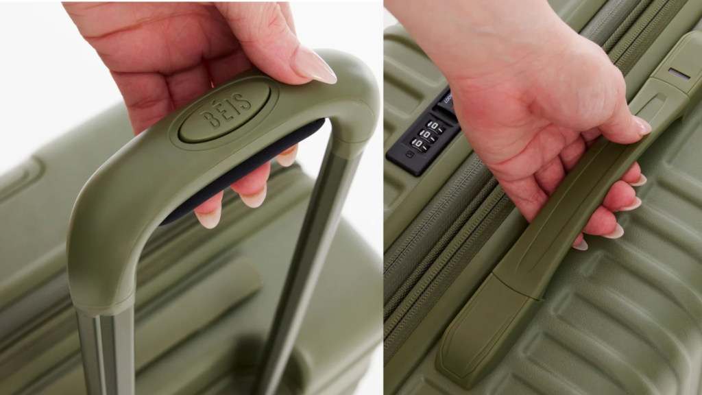 • The Extras: Béis includes a built-in weight indicator (perfect for avoiding overweight baggage fees) and a retractable bag strap to hold your tote or purse on top of the suitcase.